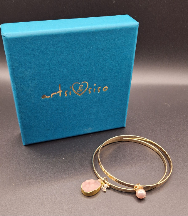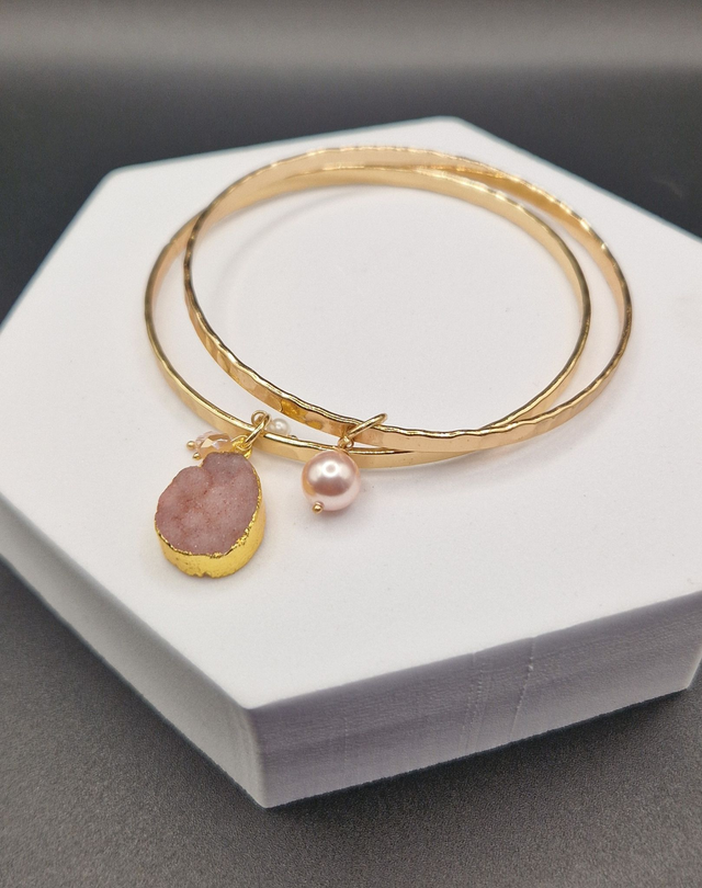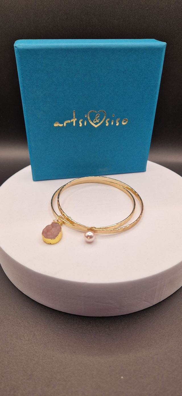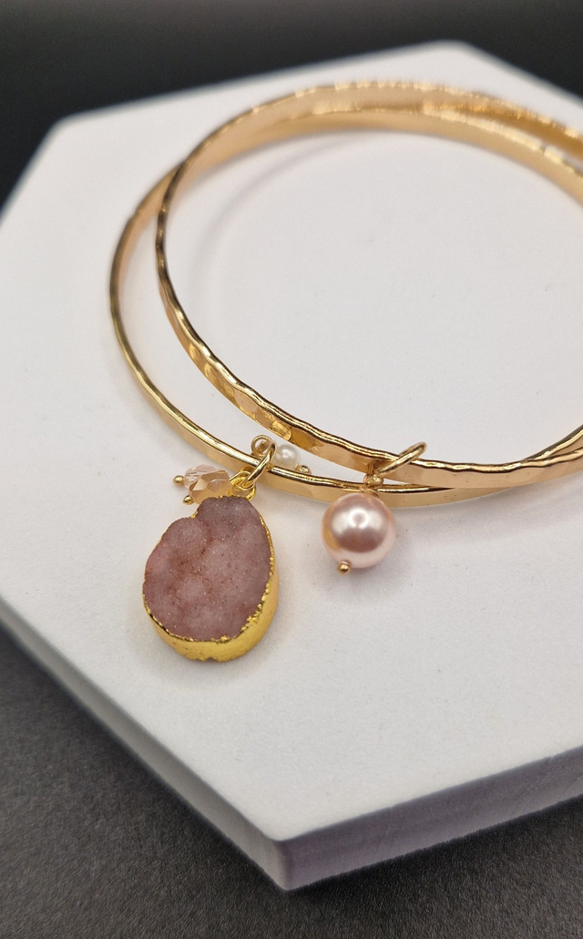💕A double bangle with a pink Druzy stone, set with pink crystal beads and an imitation pearl blush pink stone